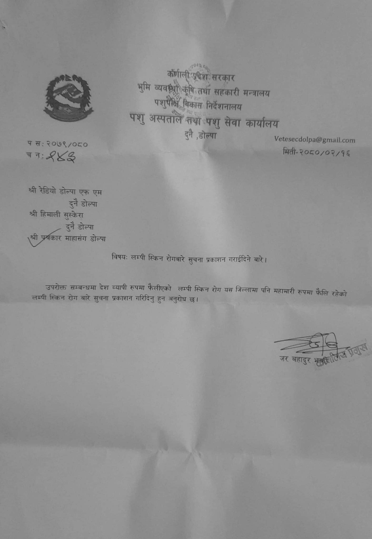 पुर्बाधार बिकास कार्यलय दुनै डोल्पाको जनहितमा जाती शन्देश